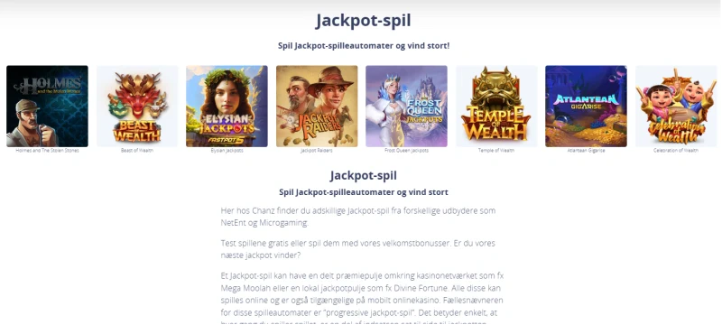 Populære jackpot valg hos casino Chanz inkluderer Holmes and the Stolen Stones, Beast of Wealth, Elysian Jackpots, Jackpot Raiders, Frost Queen Jackpots, Temple of Wealth, Atlantean Gigarise og Celebration of Wealth. Real-time tællere viser den aktuelle jackpots størrelse og opdateres efterhånden som præmien vokser på tværs af netværket.